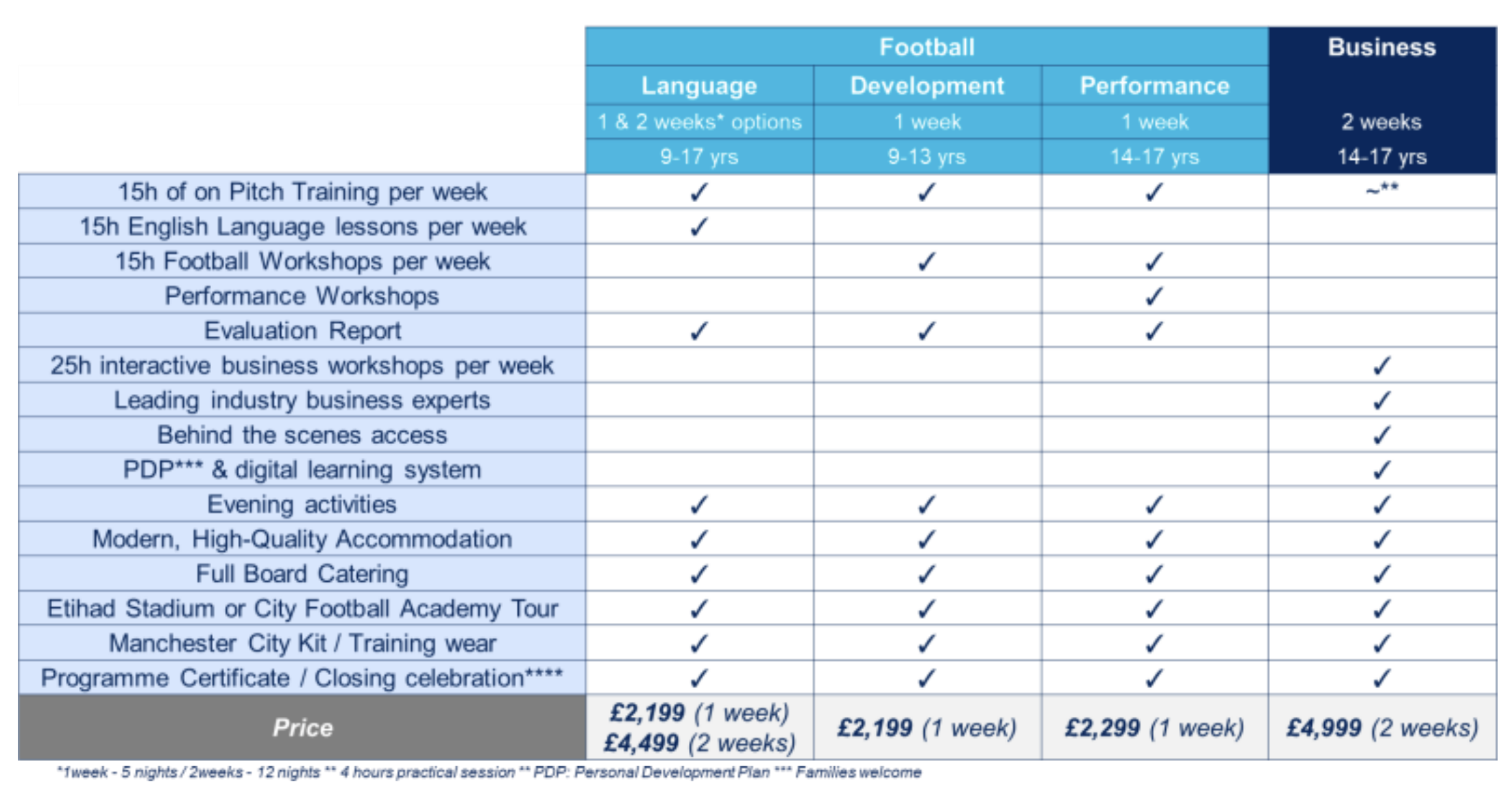 Sessions run Monday to Friday, 9:00am – 4:00pm at the Etihad Campus, with a break for lunch each day. In addition, there will be a variety of evening activities tailored to each programme that will take place each evening at the residence.